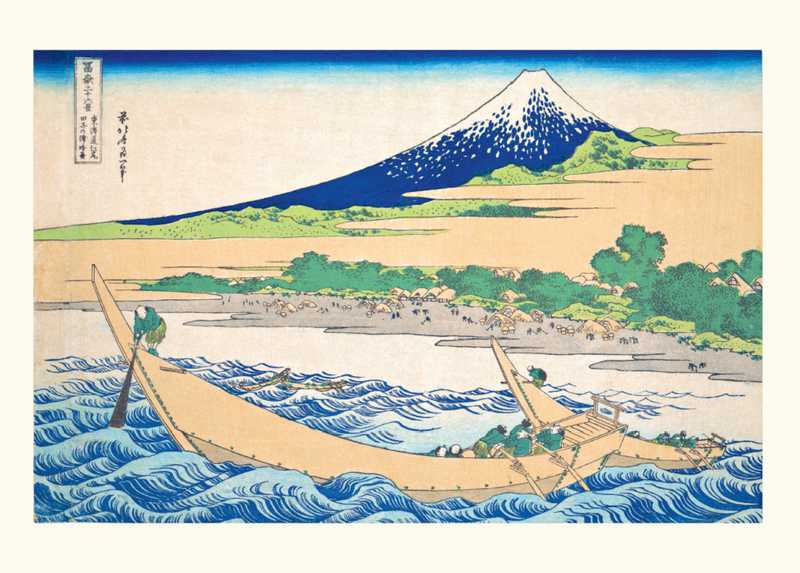 Au début des années 1830, il entreprend sa suite colorée des Trente-six vues du mont Fuji, et parvient ainsi à l’apogée de sa carrière. Consacrée tout entière au paysage, la série présente le mont Fuji selon une multitude de points de vue et de cadrages. Voyageur infatigable, Hokusai, passionné de nature, explore toutes les facettes du volcan. Parfois solitaire et majestueuse, ou esquissée dans un horizon lointain, en grande spectatrice du monde des hommes, la montagne sacrée est inébranlable malgré les saisons et le temps. Mais elle n’est pas le seul élément d’observation : le peuple, dans toute sa diversité, s’affaire, occupé à toute sorte d’activités quotidiennes, parfois en symbiose avec son environnement, paisible et bienfaisant, ou au contraire, en prise avec une nature souveraine, magnifique et impitoyable, comme pour La Grande Vague de Kanagawa. Il capture dès lors l’instantané, l’éphémère, mais également l’éternel. La nature, quant à elle, demeure et se renouvelle sans cesse sous l’égide de son grand souverain, l’immuable mont Fuji à la cime enneigée. Créatif, Hokusai joue avec la couleur, et notamment avec le bleu de Prusse, pigment artificiel importé de Hollande depuis peu, plus intense et profond que les bleus naturels traditionnellement utilisés. Le maître s’amuse des effets d’atmosphère, de l’anecdotique, et allie la tradition picturale japonaise, largement influencée par le modèle chinois, à la perspective occidentale. Le succès de ces estampes est considérable et popularise le genre du paysage. Dès lors, l’éditeur d’Hokusai lui commande dix nouvelles planches, Le Fuji vu de l’autre côté. C’est donc une intégrale de quarante-six estampes au total qui est reproduite dans ce coffret, accompagné d’un livret explicatif décrivant chacune des estampes de la suite la plus célèbre du grand maître japonais.